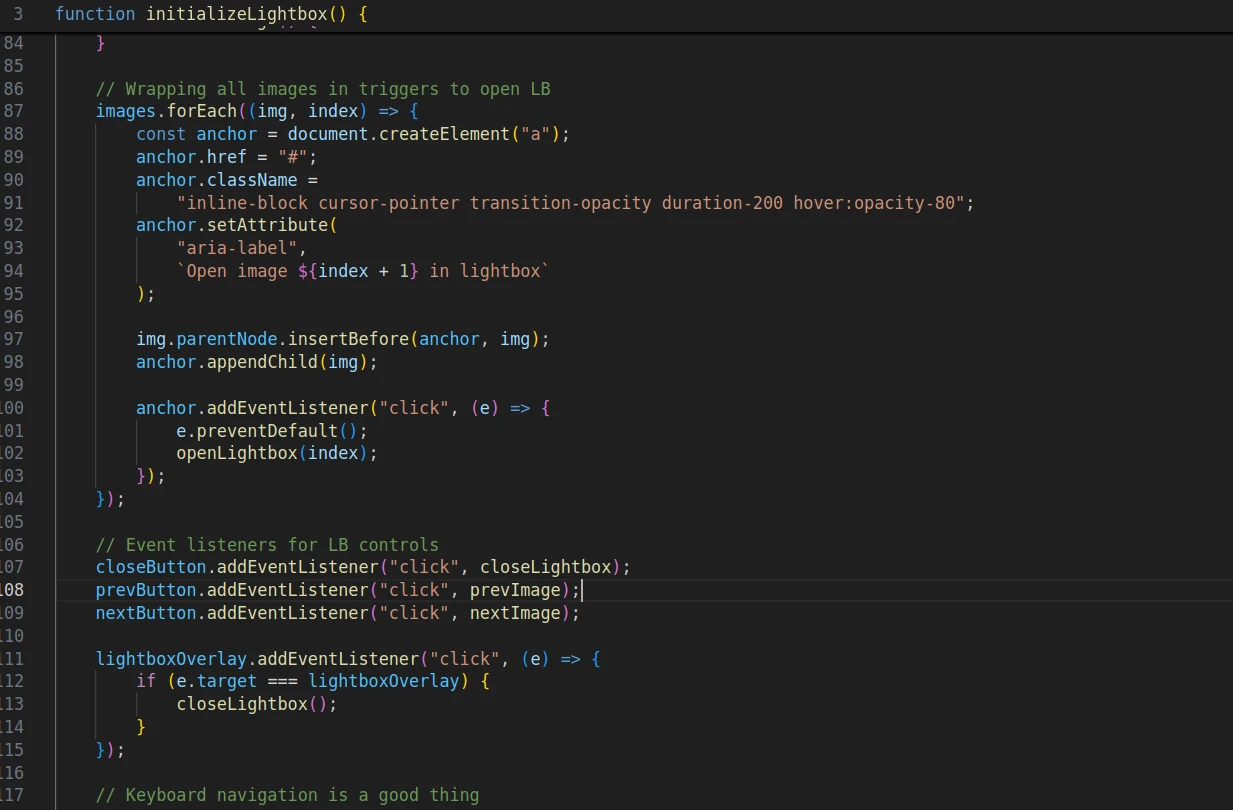 I may later refactor it to create an optional semantic-flow implementation (where a lightbox is generated for each image on load and is located right after each image), but accessibility-wise this implementation works fine for now.